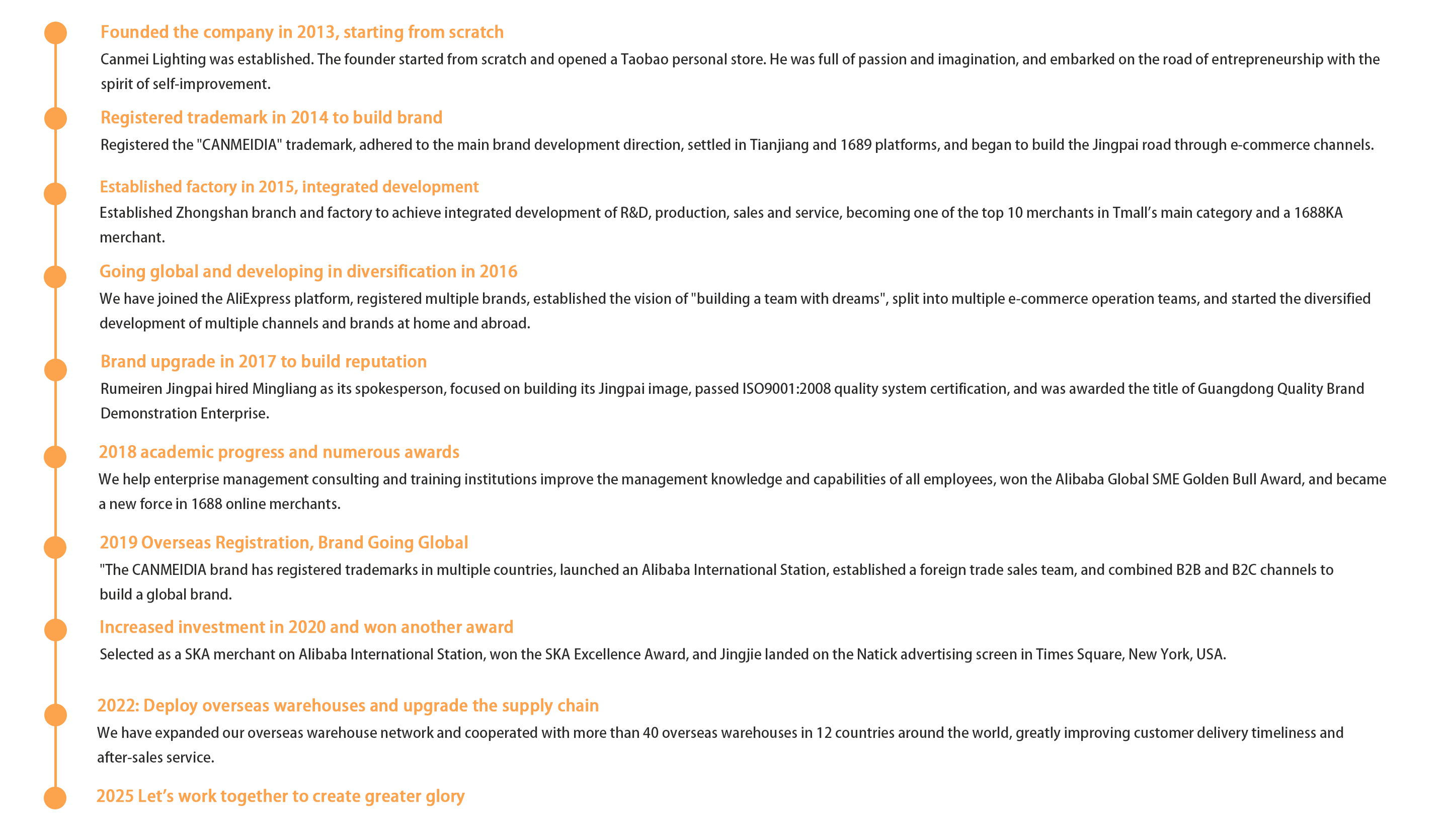 Founded in 2013, Canmeijia is a comprehensive lighting company integrating branding, R&D, design, production, marketing, and service. With the mission of "Creating Health and Comfort with Light," Canmeijia is committed to independent innovation and aims to become a pioneer in the domestic and international lighting industry.