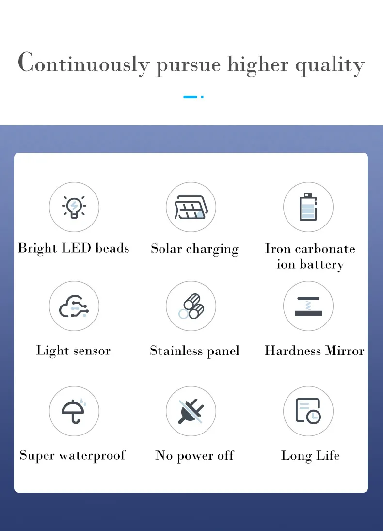 - Durable high efficient solar light, 20h after full charge, against water thunder, no wiring no electricity charge.